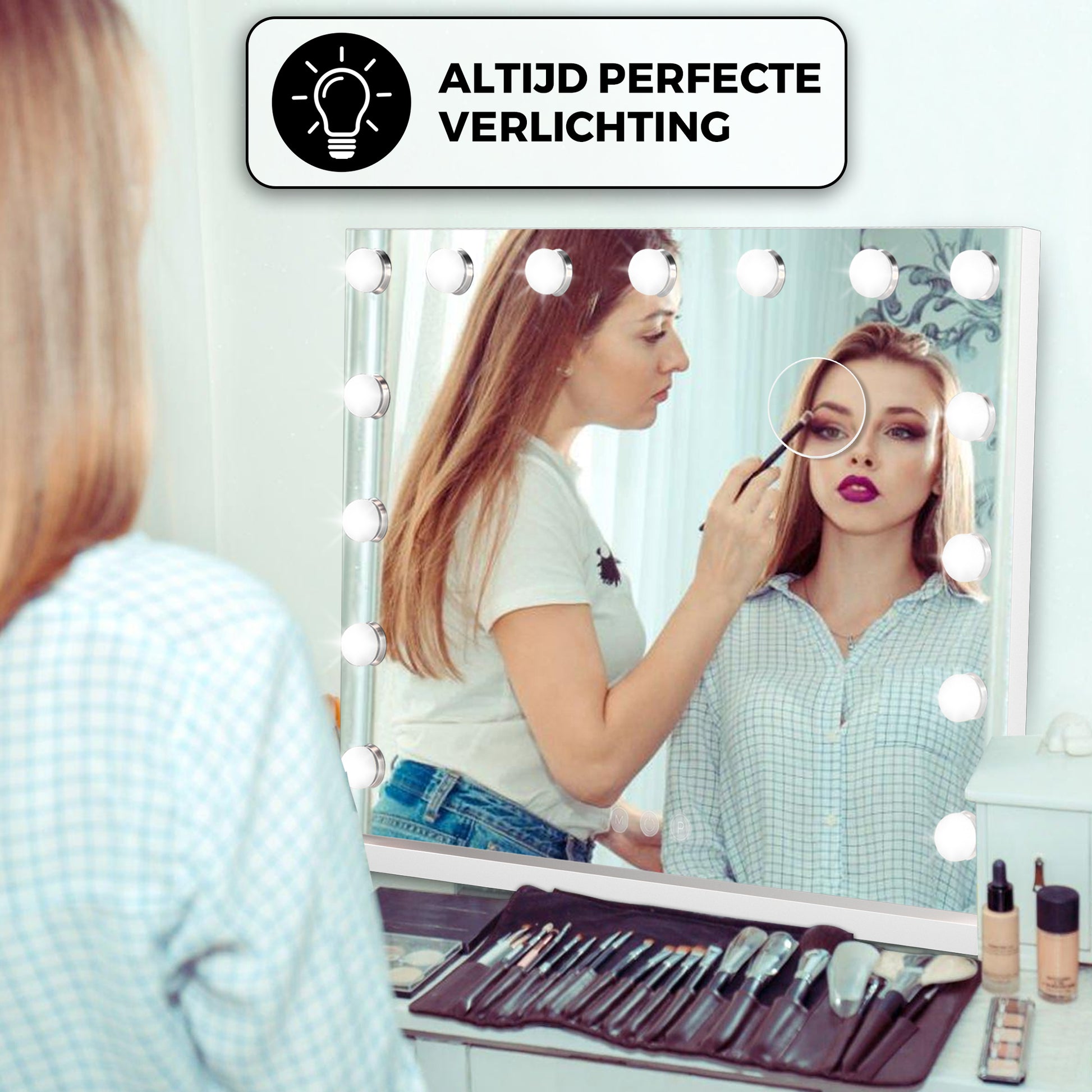 Met de Bayt Hollywood spiegel wordt jouw make-up routine naar een hoger niveau getild. De heldere verlichting, waarbij jij de helderheid kunt aanpassen, zorgt ervoor dat je elk detail perfect kunt zien. Daarnaast heeft de verlichting drie verschillende lichtniveaus: koud, warm en natuurlijk. Dit maakt het aanbrengen van make-up eenvoudiger en zorgt voor een professioneel resultaat.