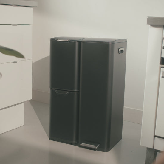 - Eén prullenbak – drie functies: Scheid restafval, plastic en papier zonder meerdere bakken in de ruimte.