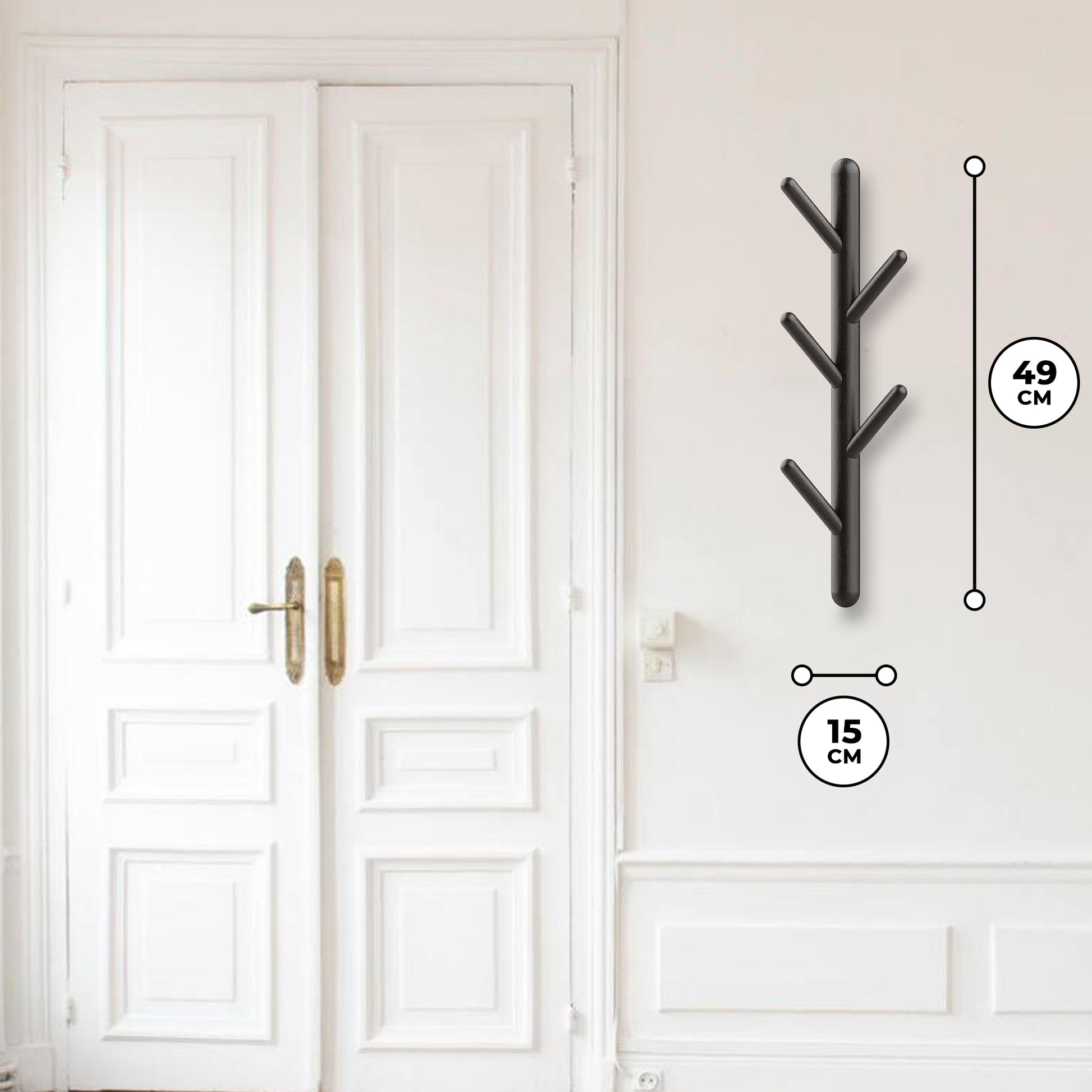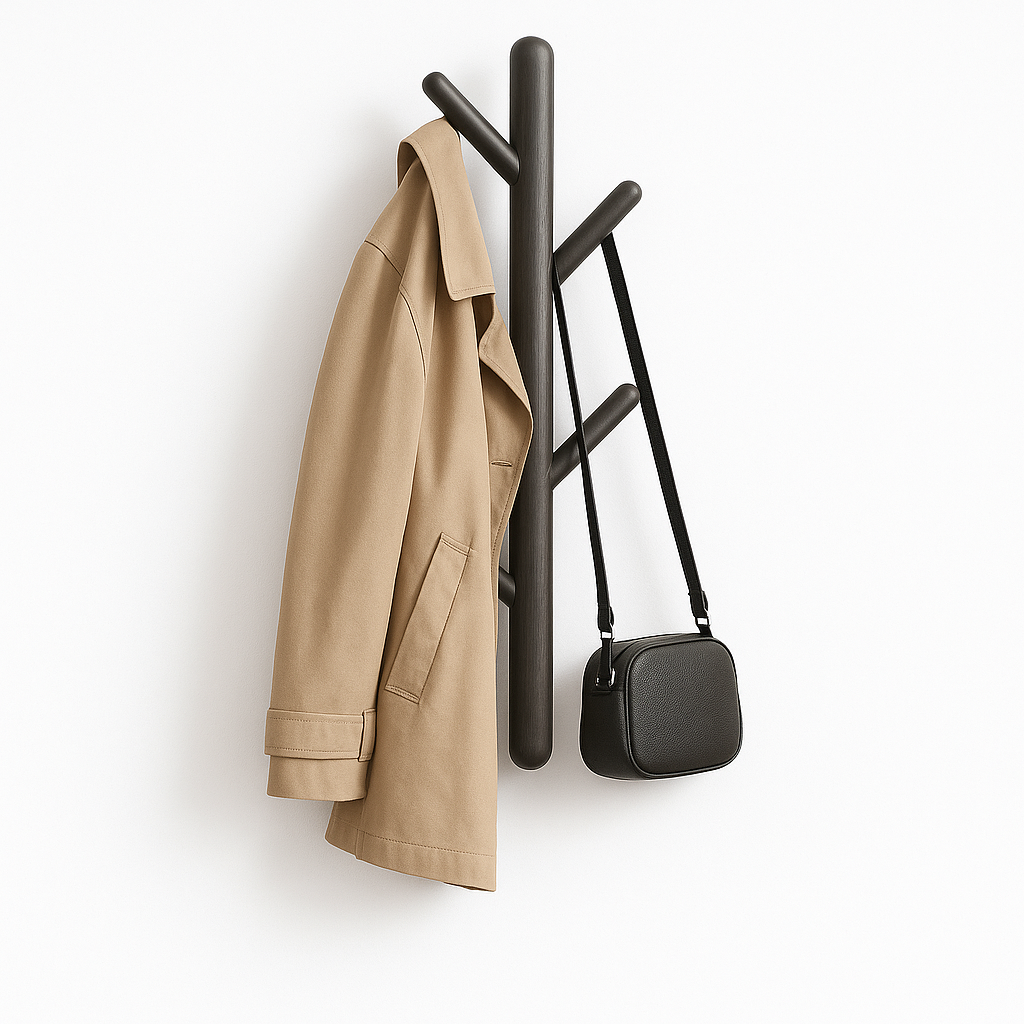 Gemaakt van hoogwaardig hout en afgewerkt in modern zwart, past dit rek perfect in elke interieurstijl – van Scandinavisch tot industrieel. Dankzij het smalle profiel (49 cm hoog en slechts 15 cm breed) is het ideaal voor kleinere muren of smalle entrees.